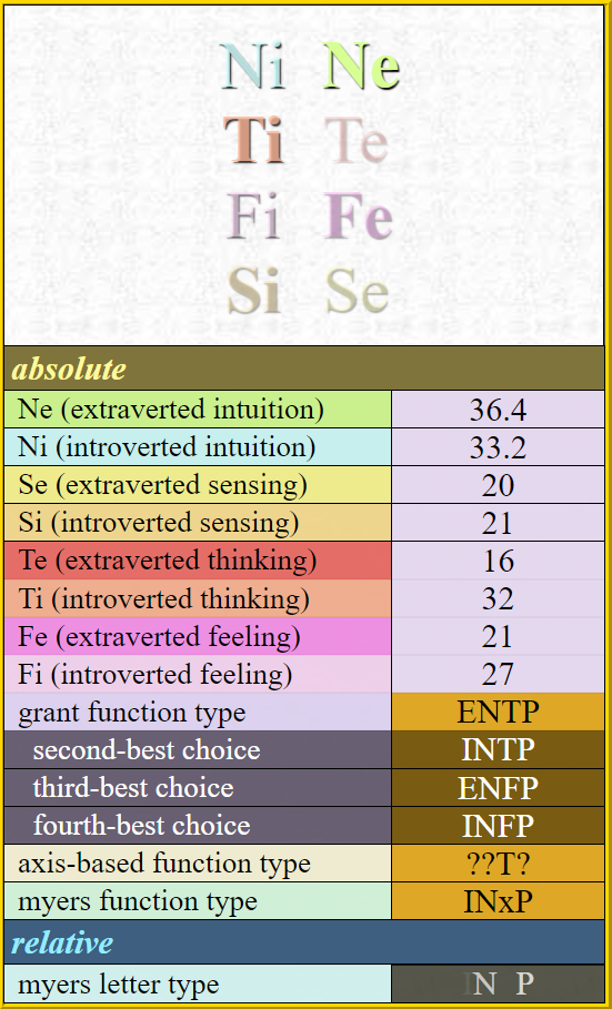 Retook this test. I've noticed that sakinorva tends to have an intuitive bias, the scores are usually much higher and specific, with decimal endings for example. I think that in reality, my Ti would be greater than my Ne/Ni. I like how it uses different methods of typing though, and it provides different likely choices in the end.